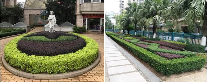 通過碎葉灌木的包邊處理,突出開花植物的美,這是銀典物業綠化管養中的特色方法,各項目根據當地的綠化品種的不同,從不同的角度對這種特色手法進行了詮釋。